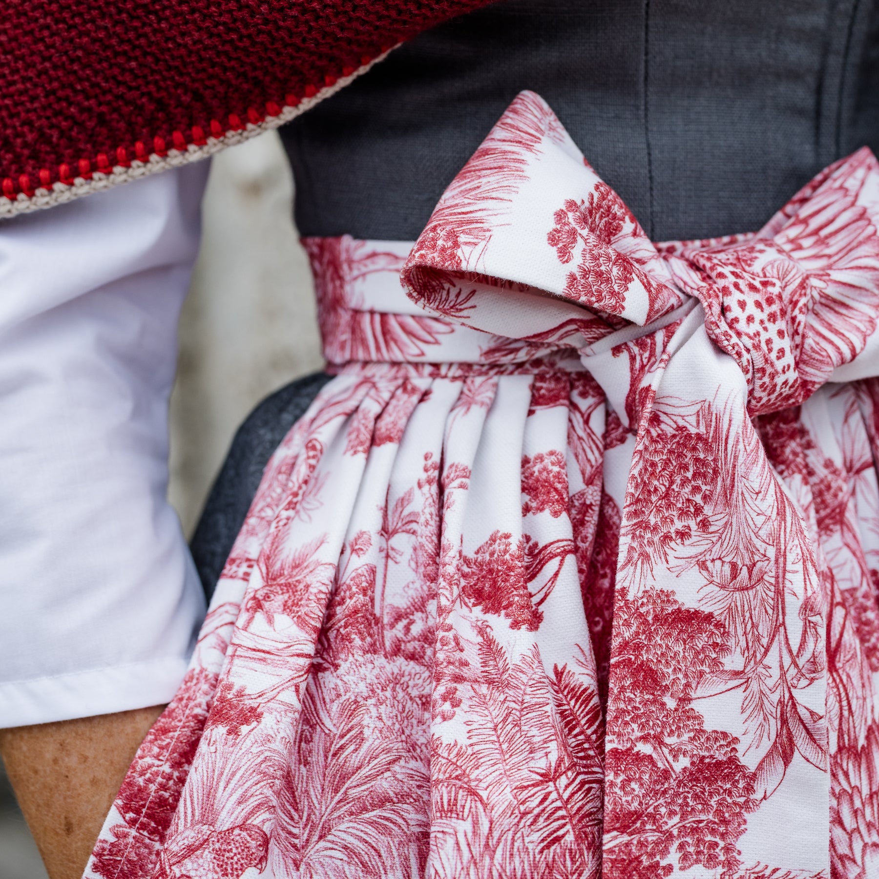 Elena ist aus einem festen Baumwollstoff und hat daher einen schönen Stand. Dieser ist aber fester als gewöhnlicher Baumwollstoff für Dirndlschürzen. Bitte beachte dies bei Deiner Bestellung. Außerdem empfehlen wir, die Dirndlschürze schmaler zu wählen.