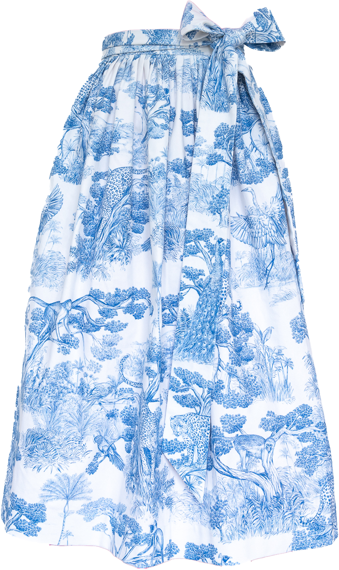 Dirndlschürze Elena hat ein etwas anderes Toile de Jouy Muster - Leoparden, Affen und exotische Pflanzen