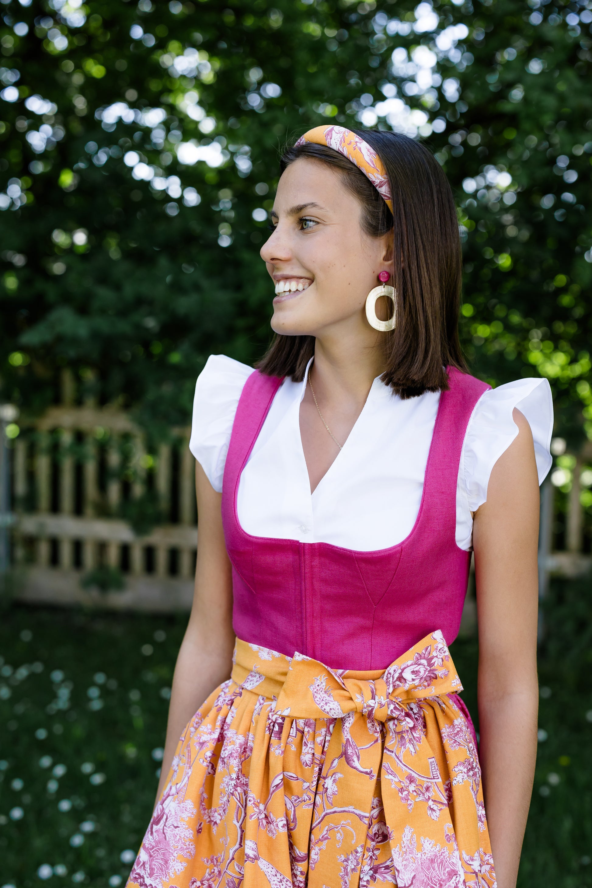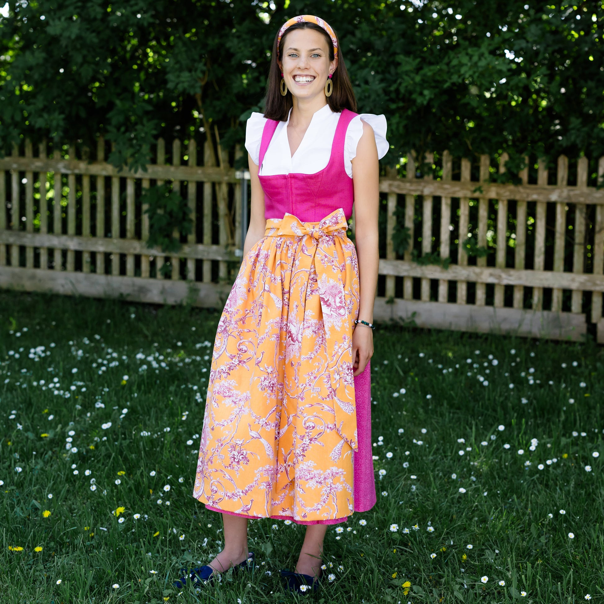 Ausgefallene Baumwoll-Dirndlschürze mit Toile de Jouy Muster in Orange und Pink
