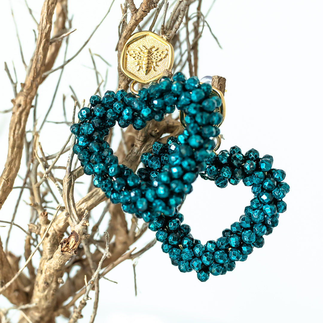 Ausdrucksstark, modern und mit liebevollen Details: Die Herz Ohrringe setzen ein funkelndes Statement. Das petrolfarbene Herz, gefertigt aus vielen kleinen facettierten Perlen, reflektiert das Licht besonders intensiv – ein Look, der sofort ins Auge fällt.