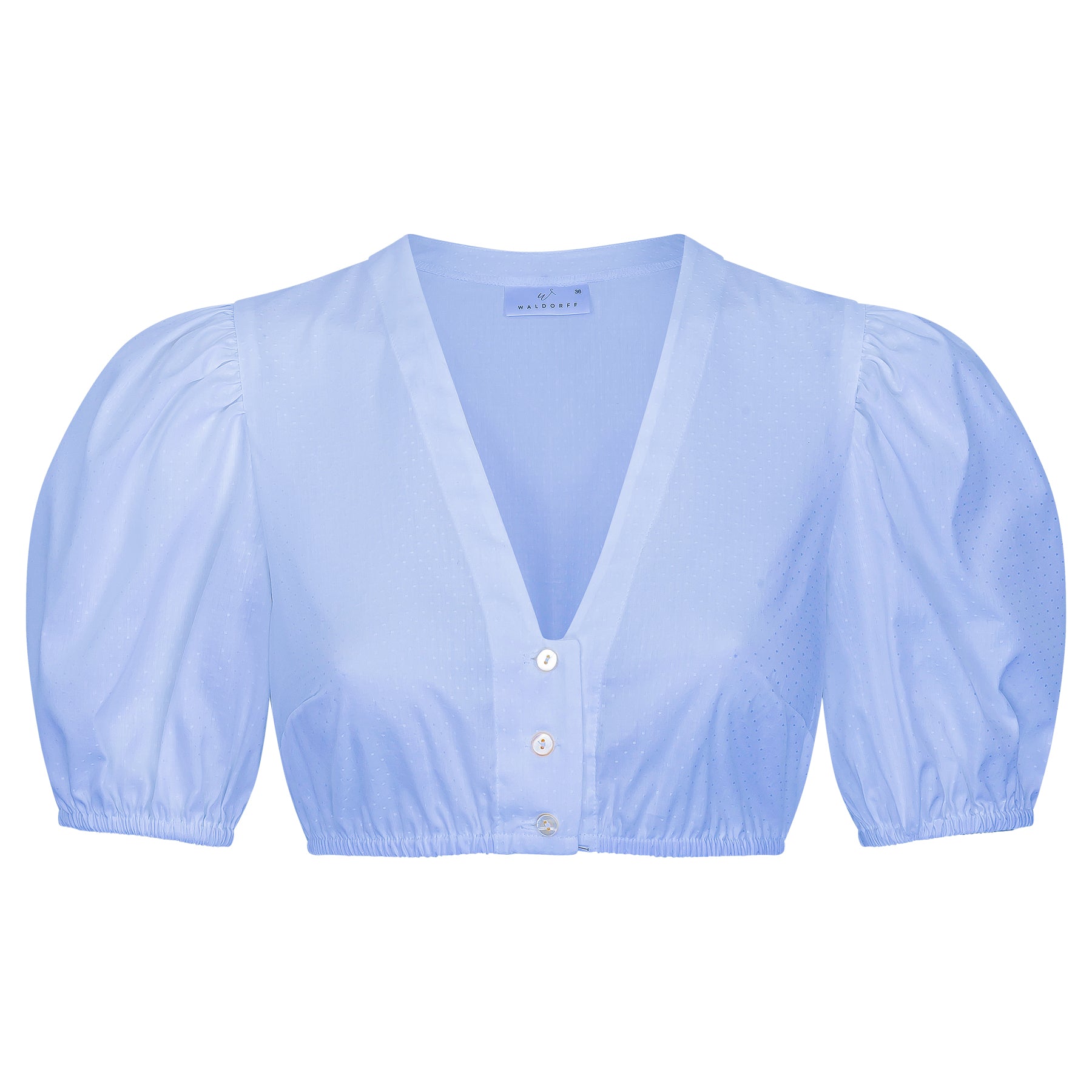 Diese Dirndlbluse von Waldorff verbindet feminine Leichtigkeit mit klassischer Eleganz. Der zarte hellblaue Stoff mit feiner Struktur verleiht der Bluse eine besondere Tiefe und wirkt gleichzeitig frisch und zeitlos.