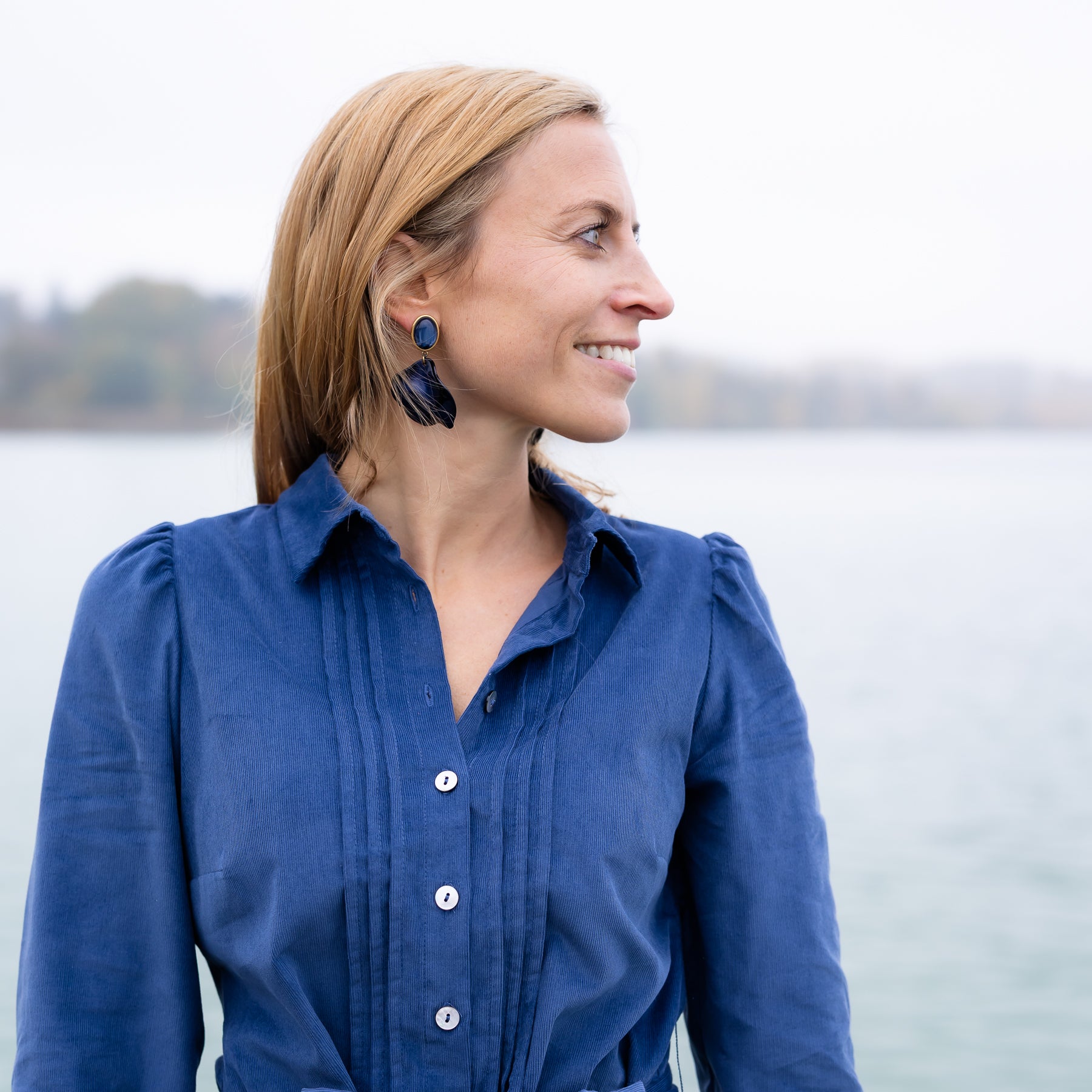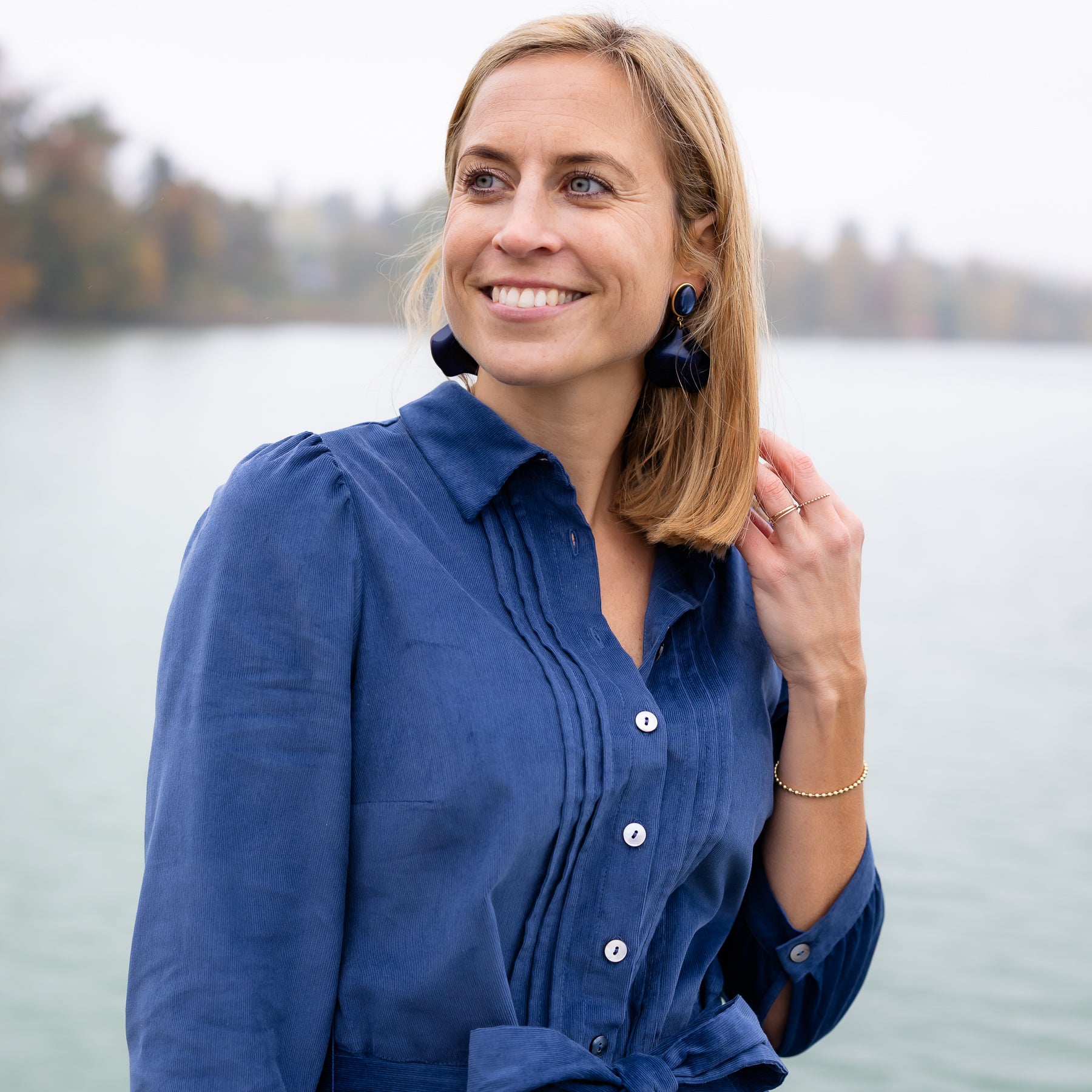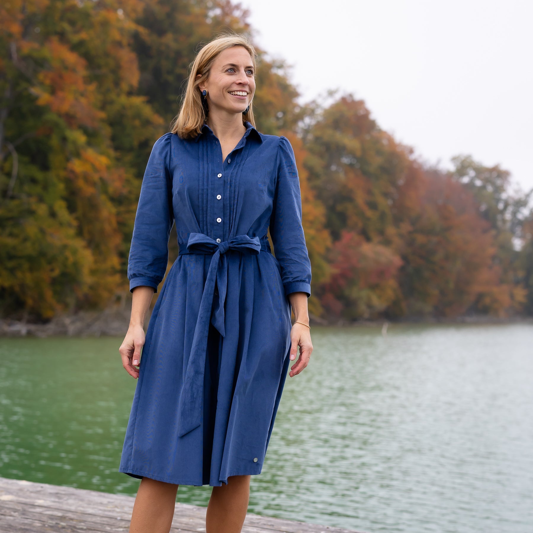 Der leicht ausgestellte Schnitt, die durchgeknöpfte Front und die weiche Haptik des Feincords machen das Kleid zu einem zeitlosen Begleiter – elegant, natürlich, mühelos.