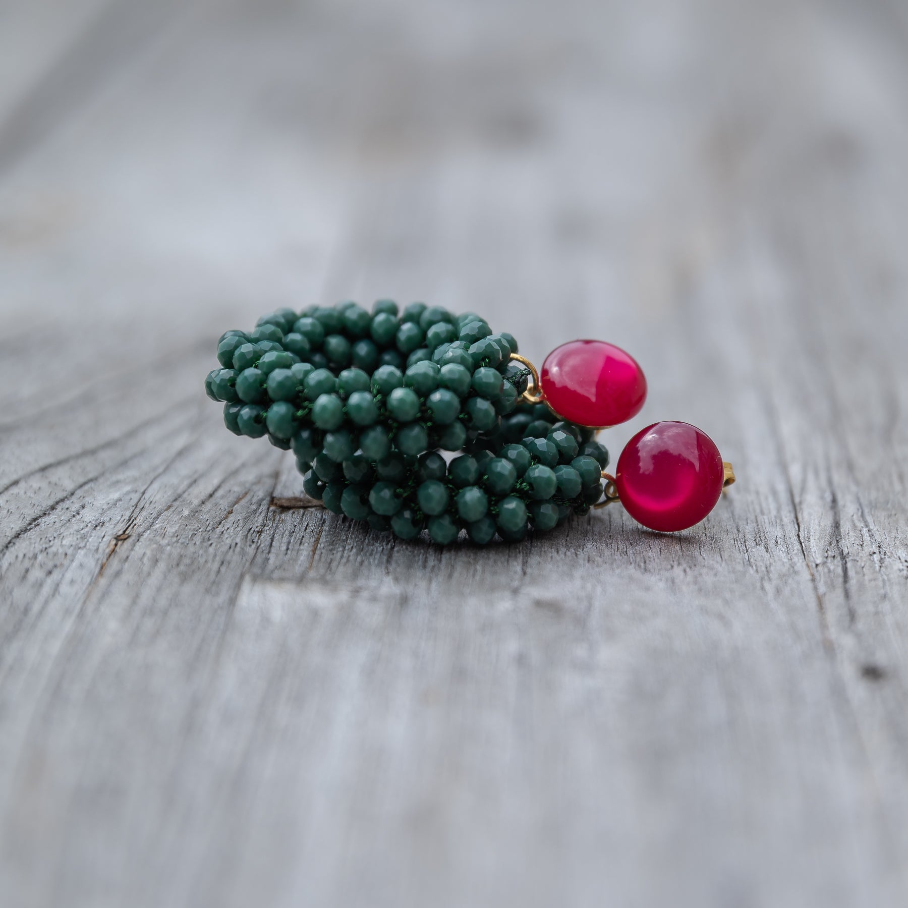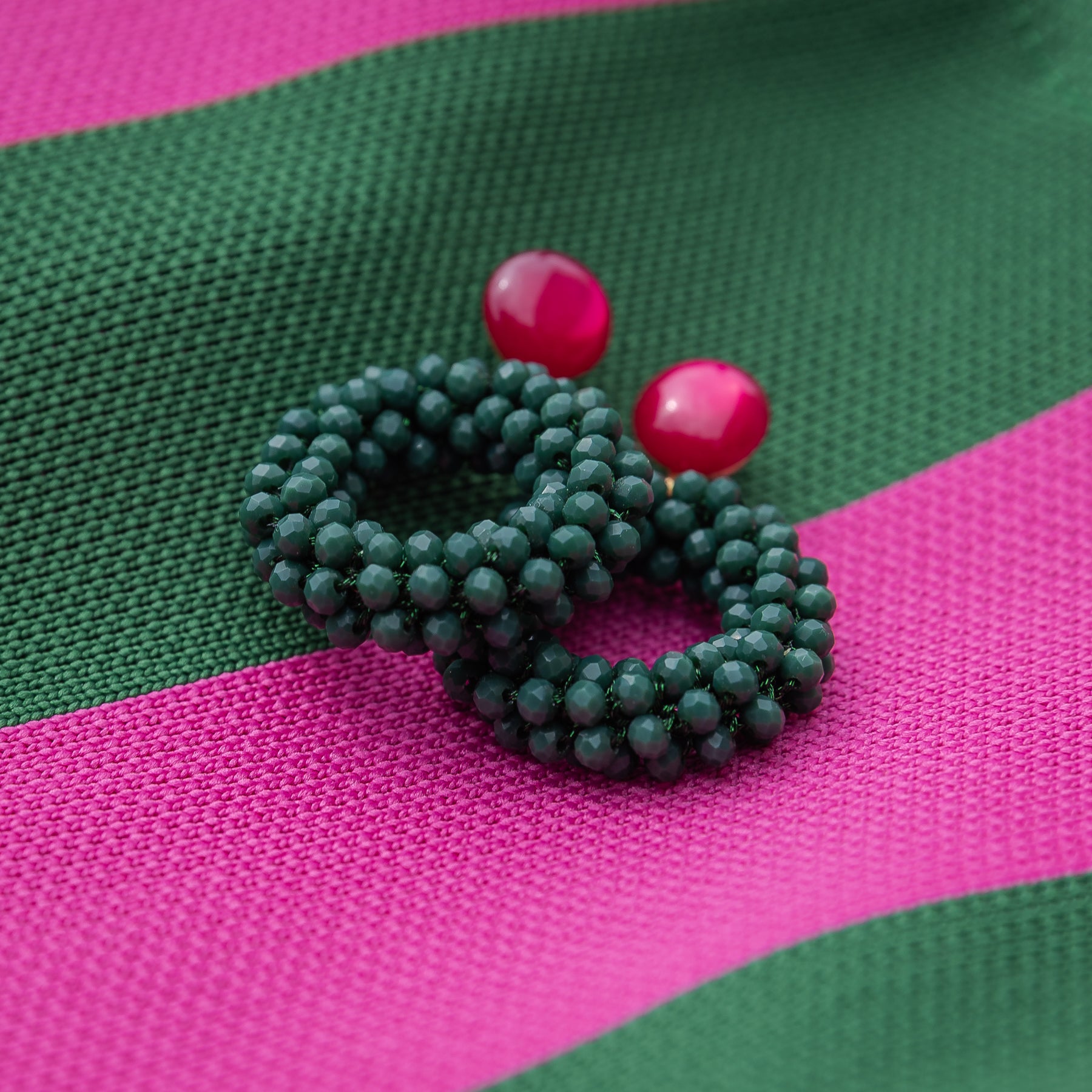 Die handgearbeiteten Ringe aus facettierten grünen Perlen wirken modern und elegant, während die pinkfarbenen Cabochons als Ohrstecker einen frischen Farbakzent setzen.